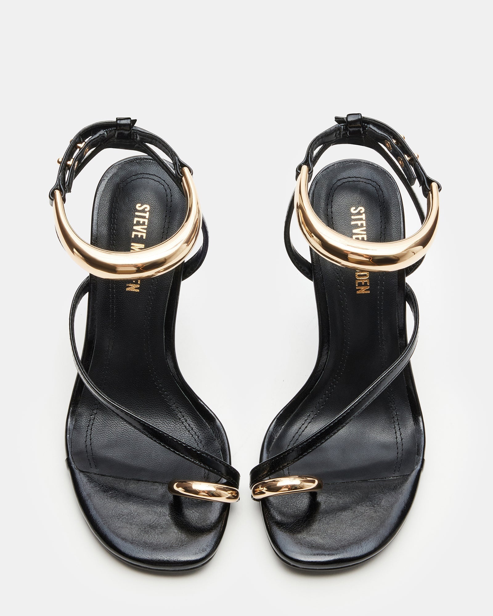 Step into style with the TIA stiletto heel. With daring gold hardware accents and a strappy design, this shoe will elevate any outfit. Unleash your boldness and conquer the day in these statement heels!